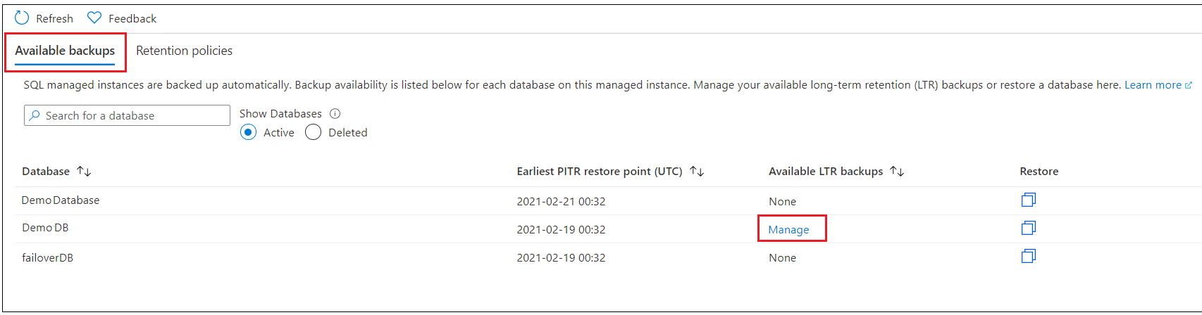 1. 在 Azure 门户中,选择 SQL 托管实例,然后选择“ 备份”。 在“可用备份”选项卡上,选择要查看其可用备份的数据库。 选择“管理”。
