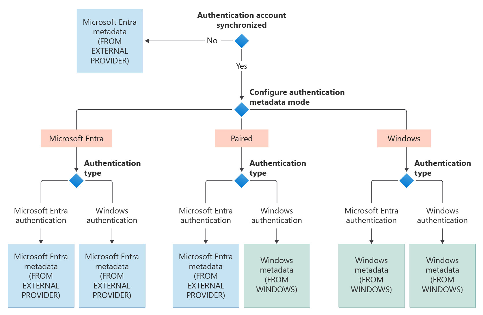 以前,在 AD 与 Microsoft Entra ID 之间同步用户的客户无法使用从 Windows 主体创建的登录名进行身份验证,无论他们使用的是 Windows 身份验证还是从 AD 同步的 Microsoft Entra 身份验证都是如此。 使用 Windows 身份验证元数据模式,客户现在可以使用 Windows 身份验证或同步的 Microsoft Entra 主体使用从 Windows 主体创建的登录名进行身份验证。