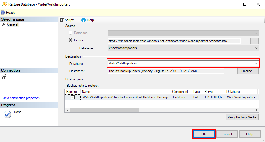 RESTORE DATABASE [WideWorldImportersExample] FROM URL = 'https://mitutorials.blob.core.windows.net/examples/WideWorldImporters-Standard.bak';提示