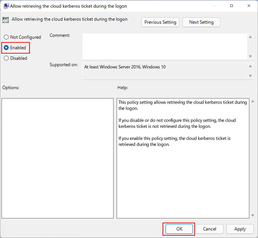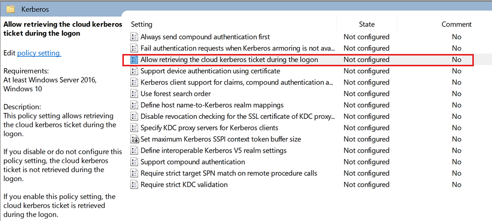 Administrative Templates\System\Kerberos\选择 登录设置期间允许检索云 kerberos 票证 。