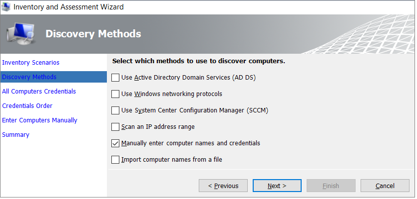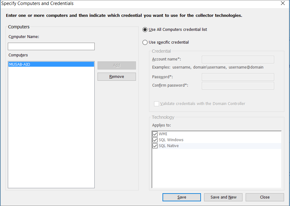 为要发现的每台计算机输入凭据。 可对每台计算机/机器使用唯一凭据,也可使用“所有计算机凭据”列表。