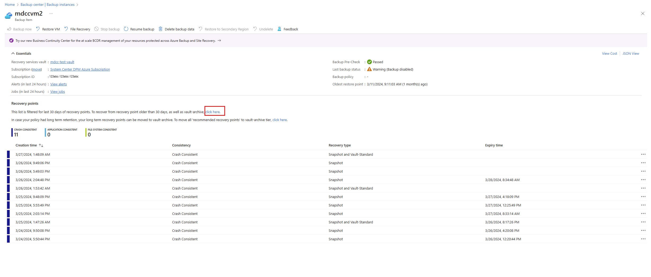要查看恢复点类型,请转到“备份实例”,然后选择“链接”,以查看所有恢复点。