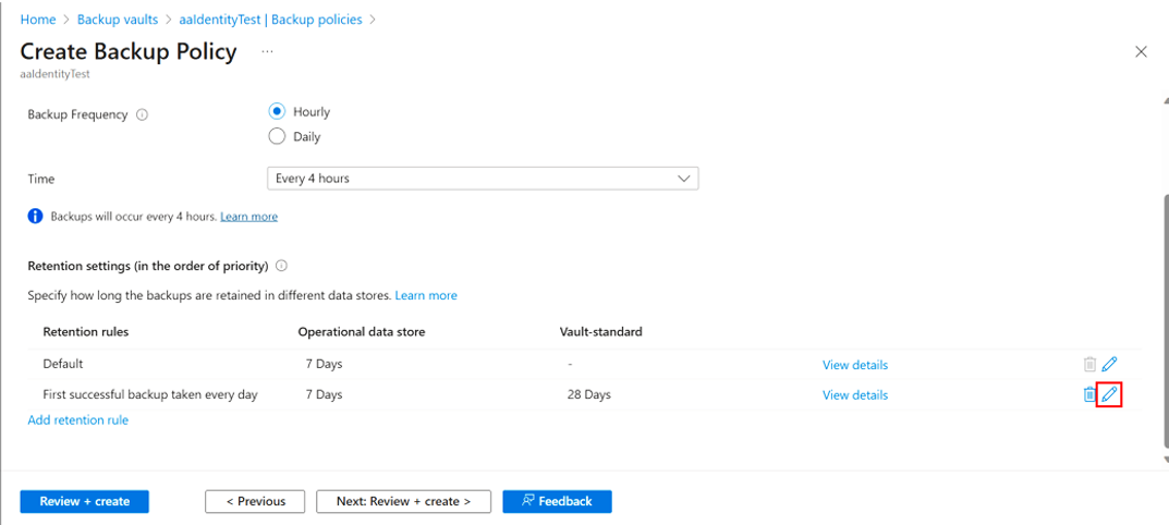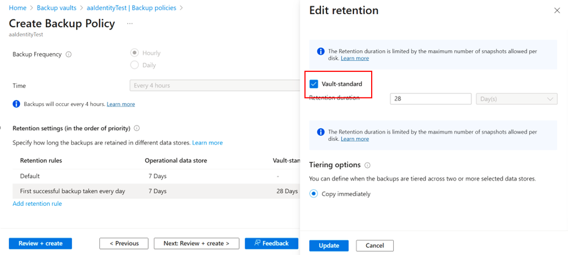 建议的操作:使用在 Azure 门户上定义的保管库标准持续时间更新保留规则: