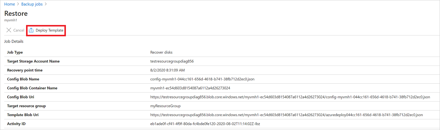 - 使用执行还原操作期间生成的模板来自定义设置,并触发 VM 部署。 编辑默认模板设置,然后提交模板进行 VM 部署。