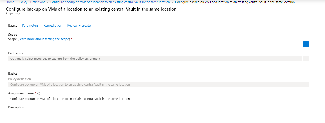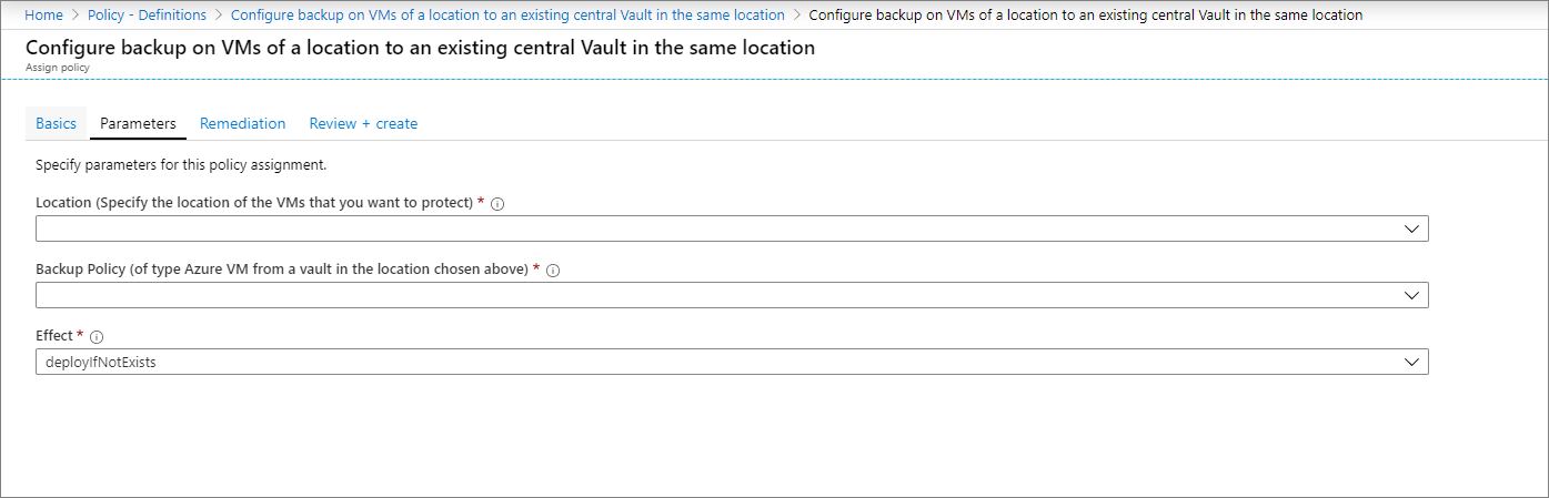 在参数选项卡上,为作用域中的 VM 选择要关联的位置、保管库和备份策略。