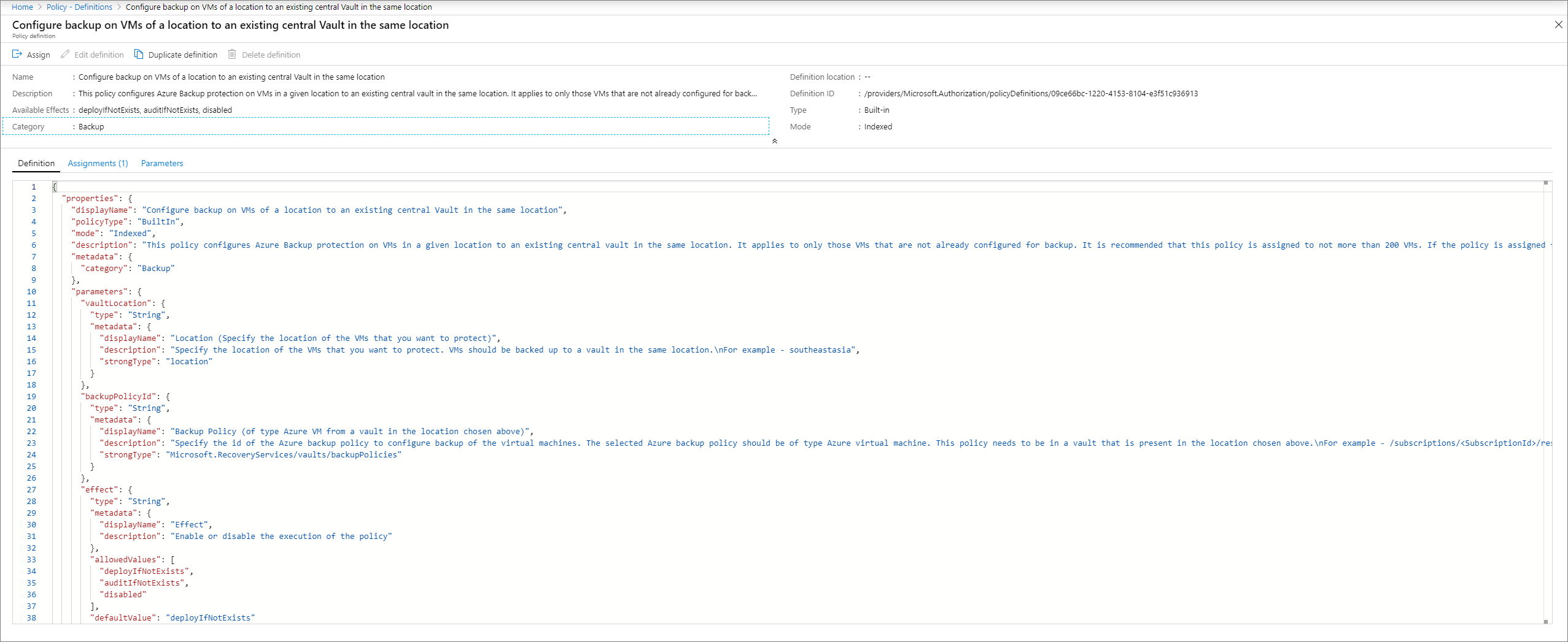 本部分概述了分配 策略 1 的端到端步骤。 相同的说明适用于其他策略。 分配后,策略会自动为在定义范围内创建的任何新 VM 配置备份。