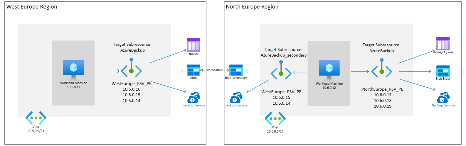 保管库的私有端点使用 10 个私有 IP,数量可能会随时间增加。 建议在尝试为 Azure Backup 创建专用终结点时,确保拥有充足的可用私人 IP 地址(/25)。