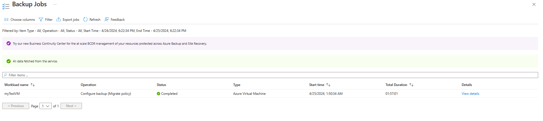 若要在 “备份项 ”窗格中监视迁移作业,请选择“ 查看作业”。