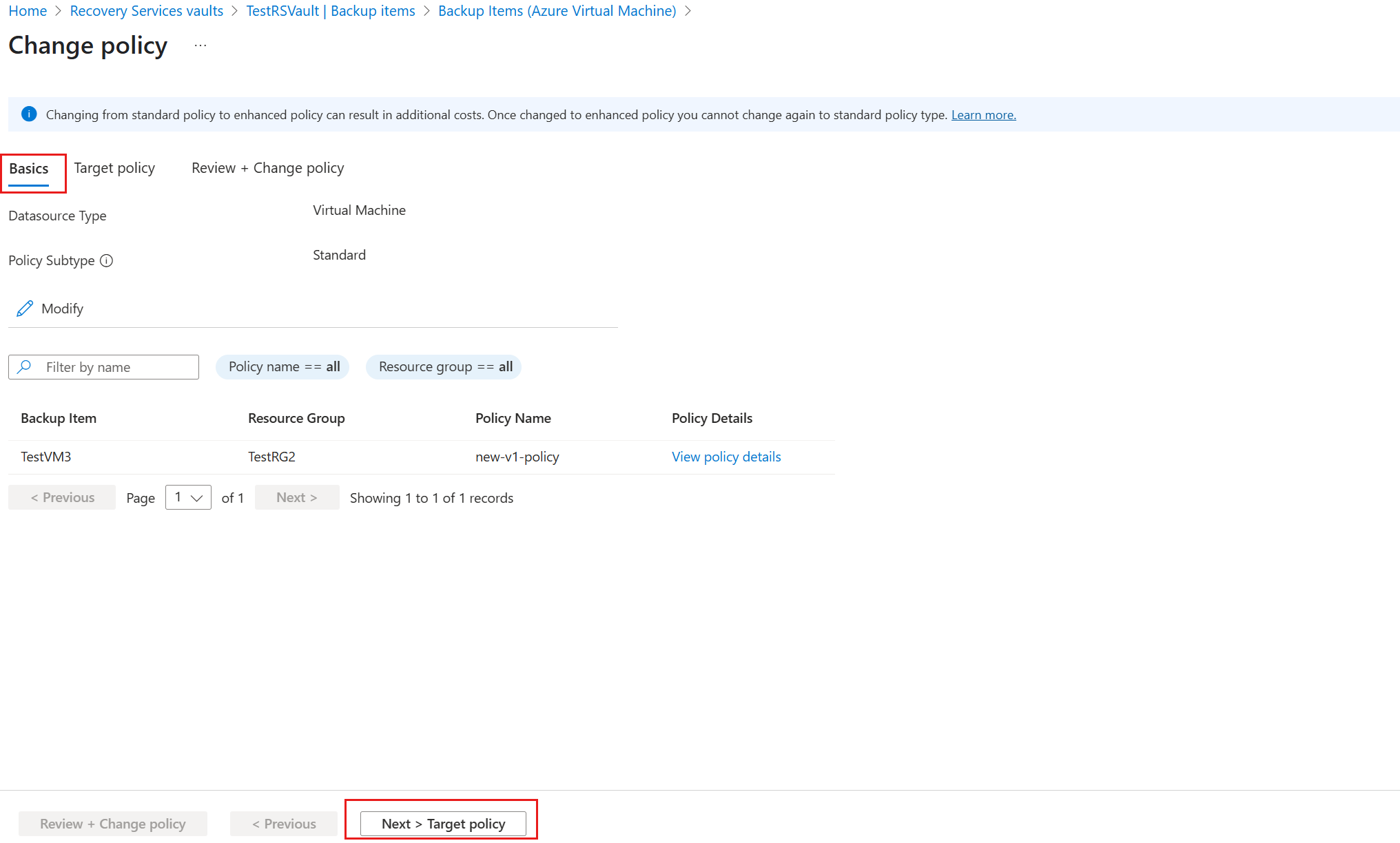 在 “更改策略 ”窗格的“ 基本信息 ”选项卡上,查看 VM 的选择,然后选择“ 下一目标 > ”策略。