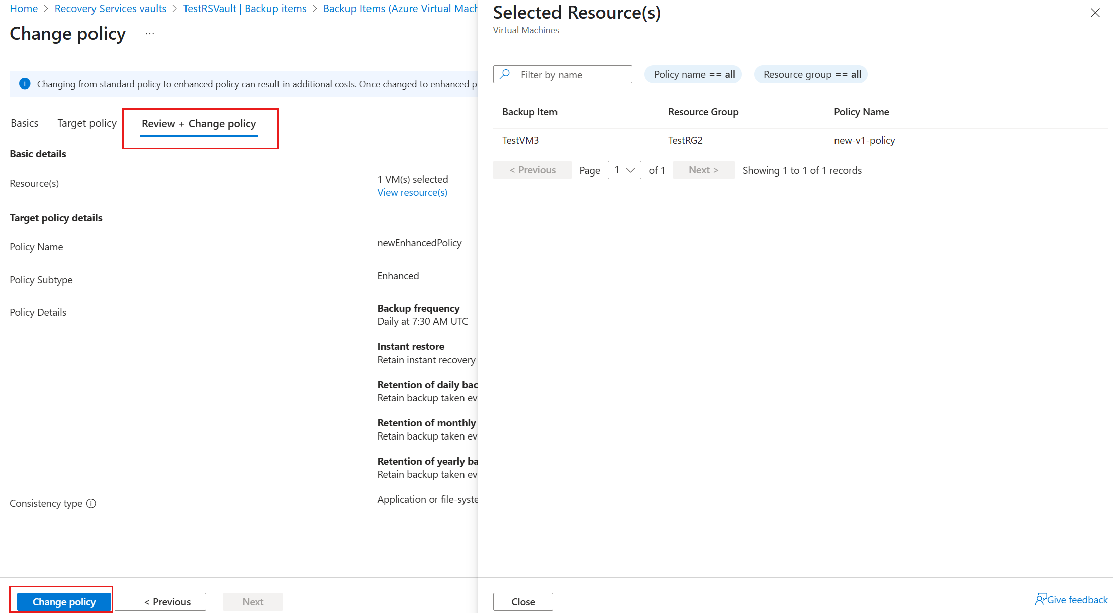 在“ 查看 + 更改策略 ”选项卡上,验证 VM 和目标策略的选择,然后选择“ 更改策略”。