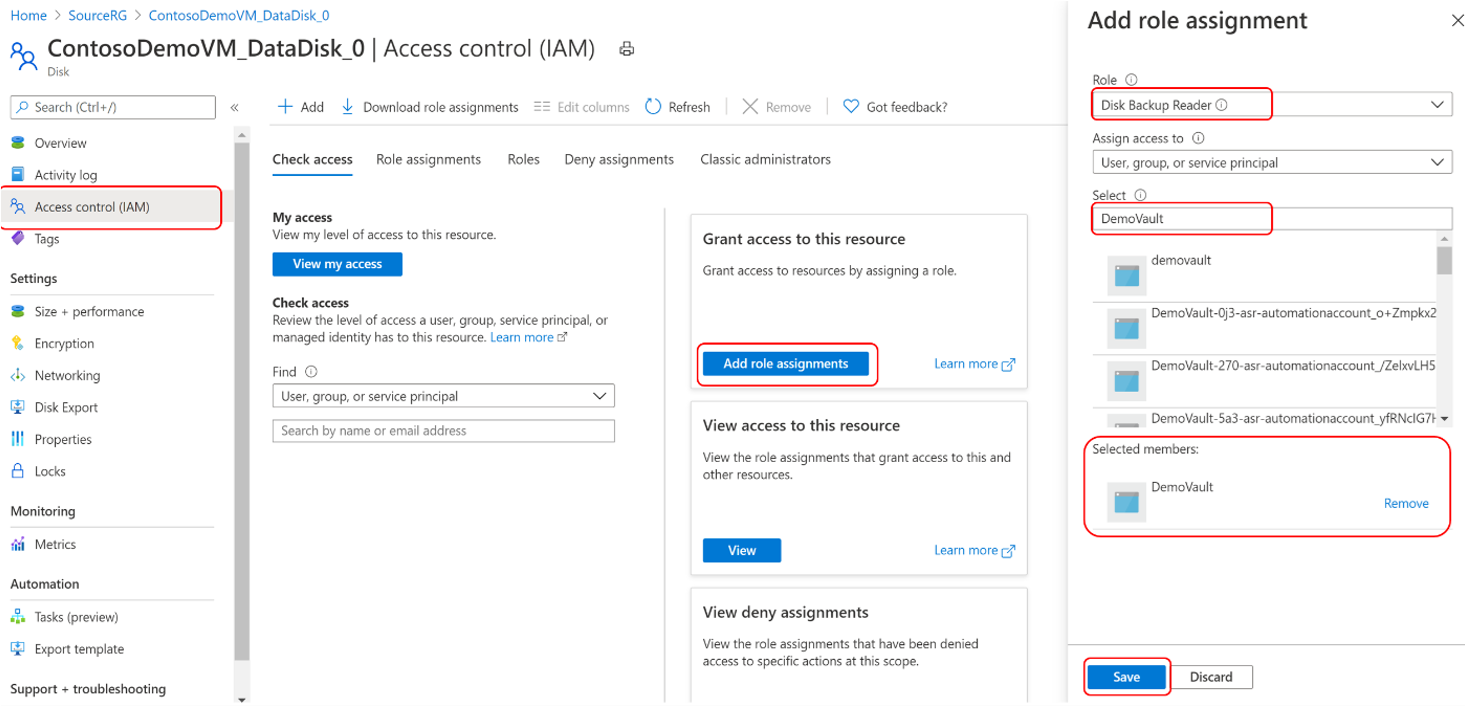 用户需要通过 RBAC 向保管库(保管库 MSI 表示)、相关磁盘和/或磁盘 RG 分配少量权限。 可以通过门户或 PowerShell 执行上述操作。