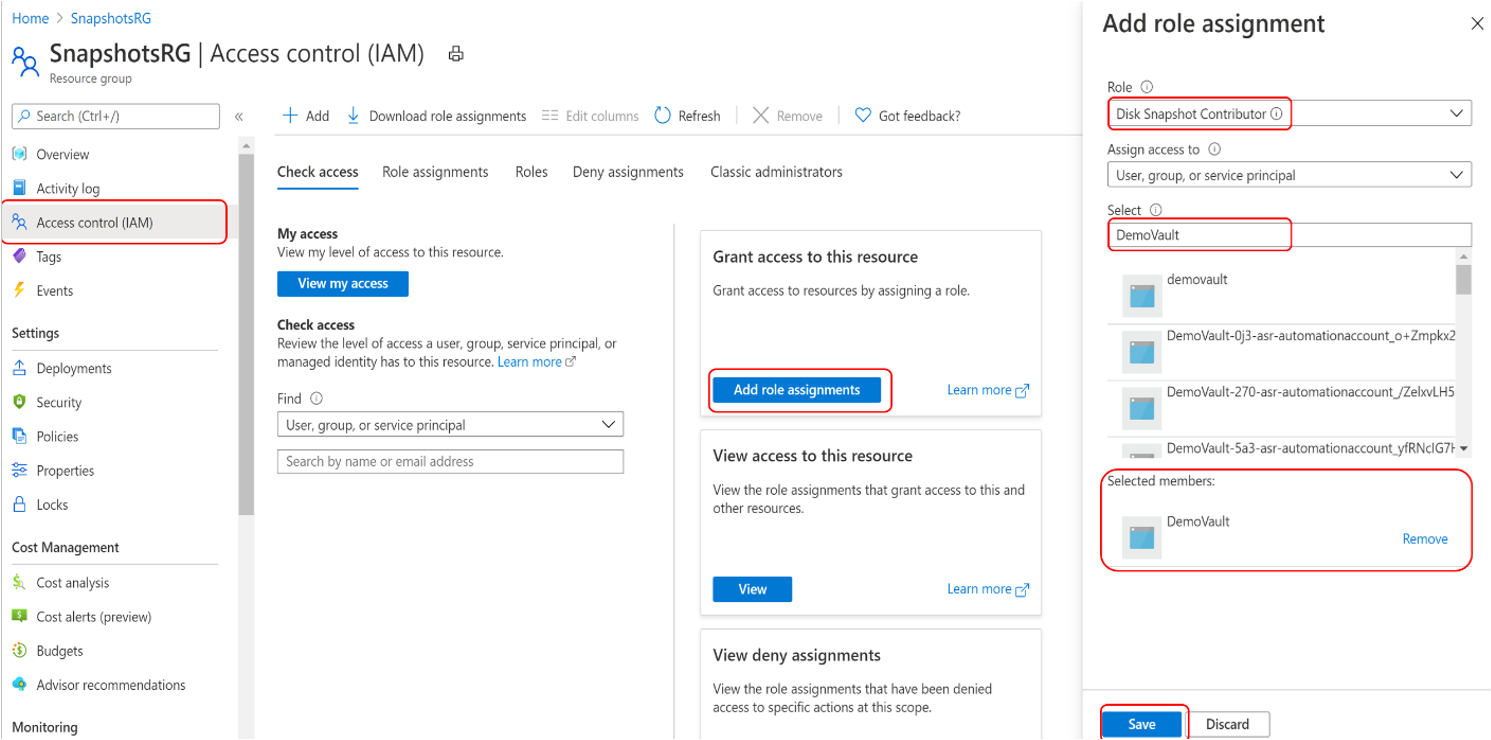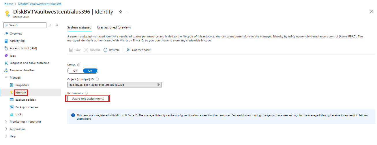 验证备份保管库的托管标识在作为快照数据存储区的源磁盘和资源组上是否具有正确的角色分配。