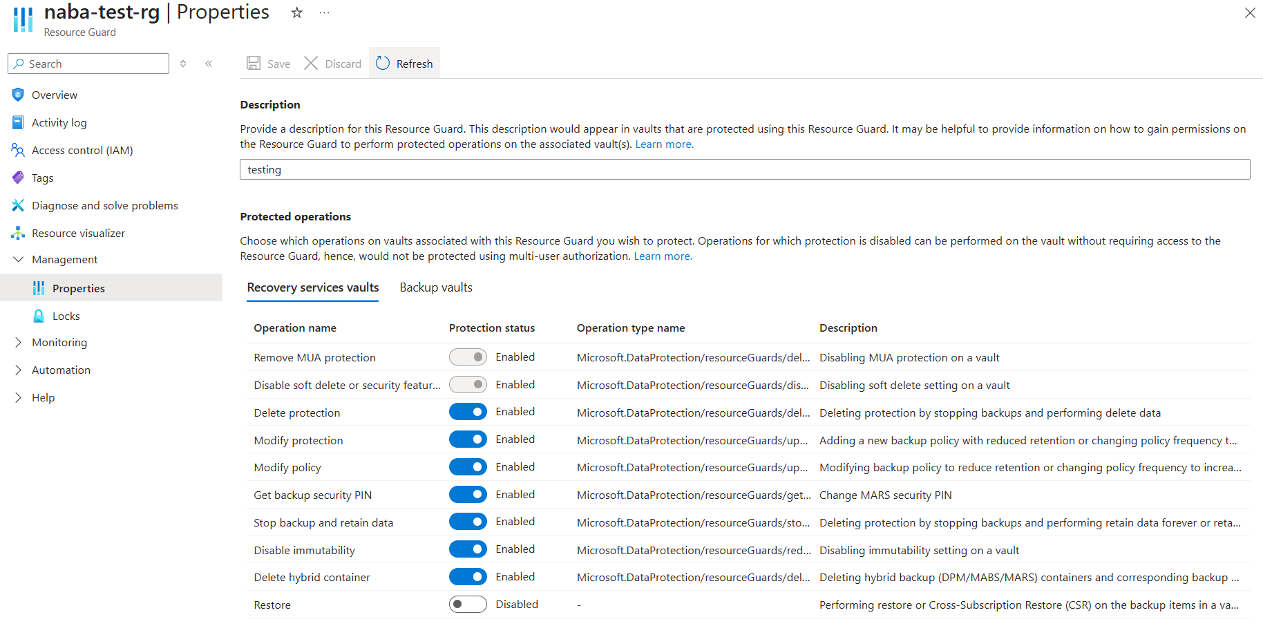 - Resource Guard 和备份保管库必须位于同一 Azure 区域中。