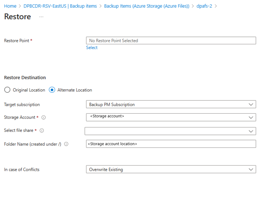 保管库备份当前仅支持将完全共享恢复到备用位置。 为还原选择的目标文件共享需要为空。