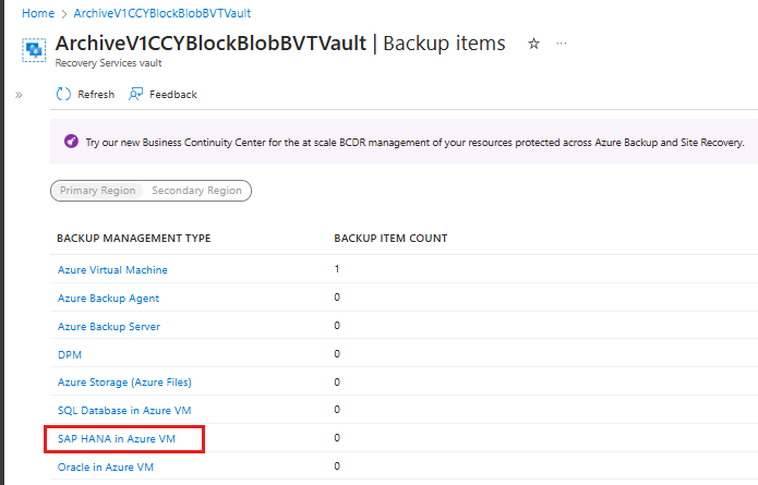 在 Backup Items 边栏选项卡上,选择 备份管理类型为 在 Azure 虚拟机中的 SAP HANA。