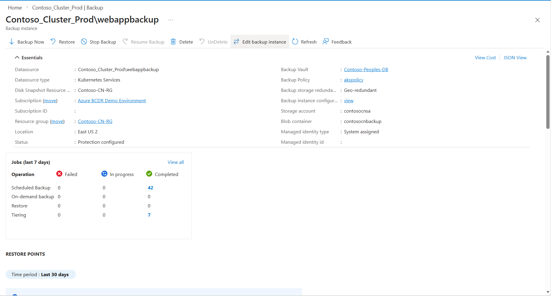 找到 AKS 群集备份实例,打开它并单击顶部 的“编辑备份实例 ”。