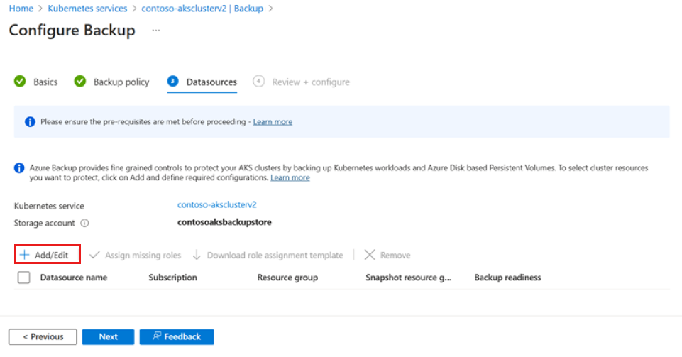 在“数据源”选项卡上,选择“添加/编辑”以定义备份实例。