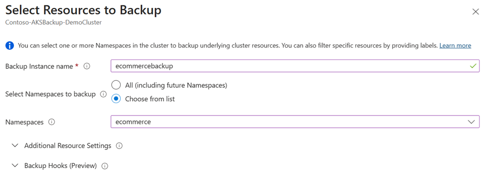 对于“备份实例名称”,请输入一个值,并将其分配给为 AKS 群集中的应用程序配置的备份实例。