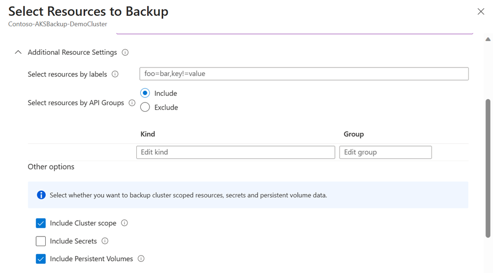 展开“其他资源设置”以查看可用于选择要备份的群集资源的筛选器。 可以选择根据以下类别备份资源: