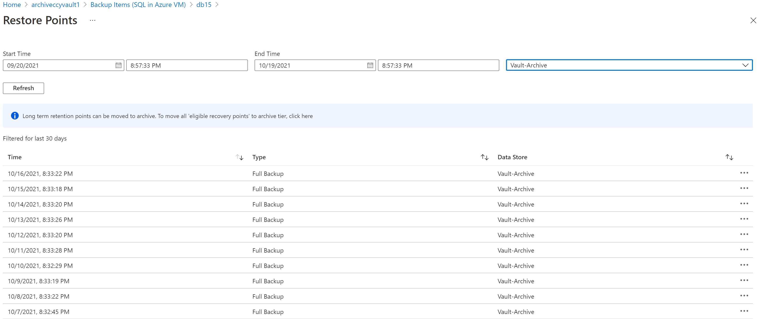 az backup recoverypoint list -g {rg} -v {vault} -c {container} -i {item} --backup-management-type {AzureIaasVM} --workload-type {VM} --target-tier {VaultArchive} --is-ready-for-move {True}对于 Azure 虚拟机中的 SQL Server