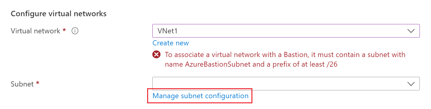 若要配置 AzureBastionSubnet,请选择“管理子网配置”。