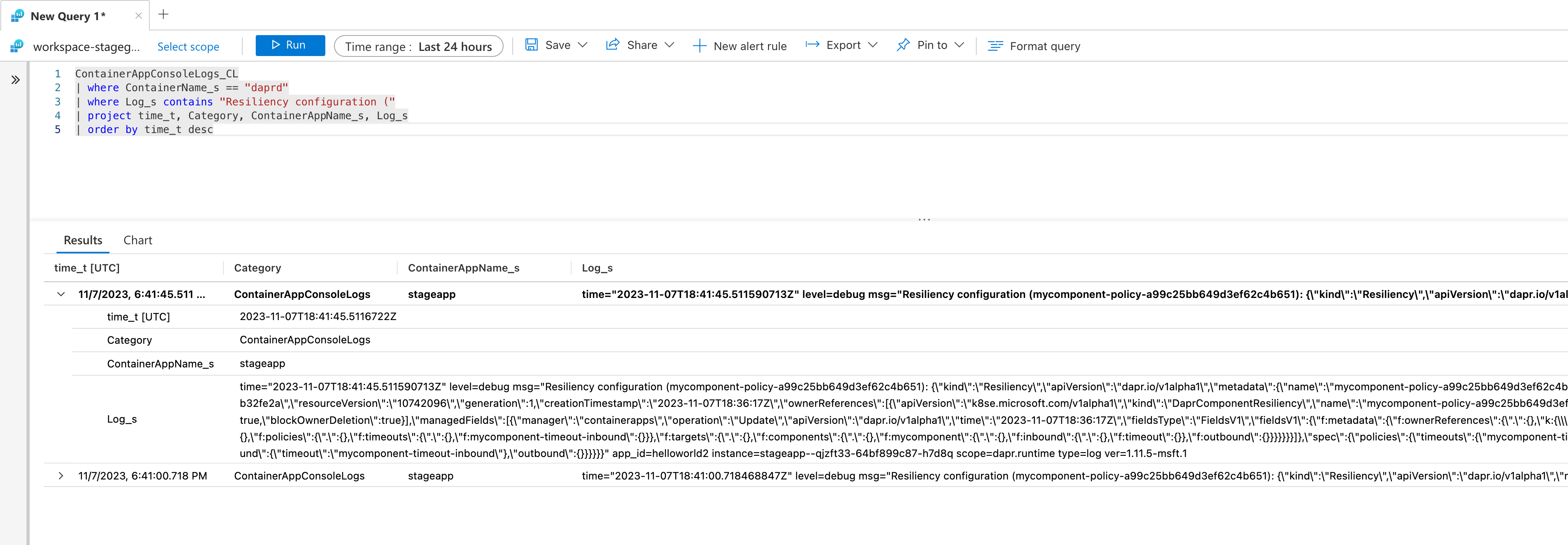 | where ContainerName_s == "daprd"