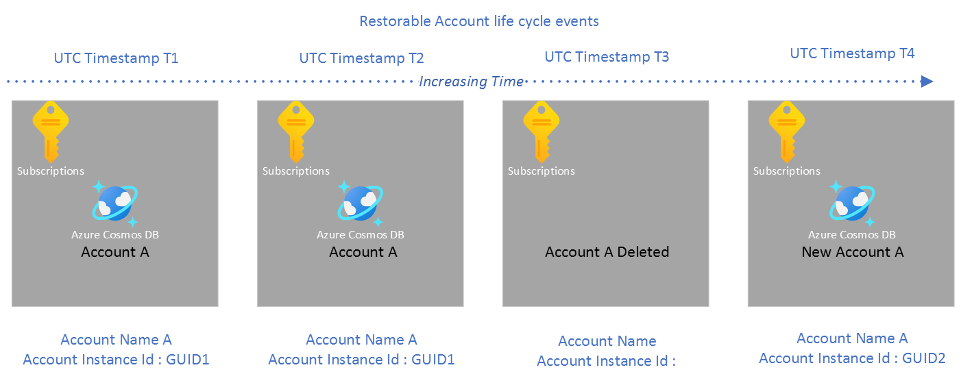 方案 1 - 还原已删除的帐户:可以在 “还原 ”窗格中看到所有可以还原的已删除帐户。 例如,如果在时间戳 T3 处删除了帐户 A。 在本例中,在 T3、位置、目标帐户名、资源组和目标帐户名之前,时间戳足以从 Azure portal、PowerShell 或 CLI 还原。