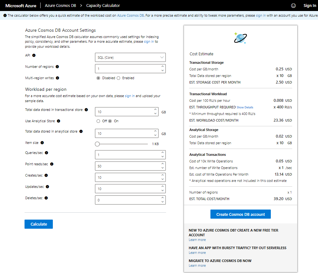 | 基本 | 提供快速、高级 RU/秒和成本估算。 此模式假定用于索引策略、一致性和其他参数的默认 Azure Cosmos DB 设置。 在评估在 Azure Cosmos DB 上运行的潜在工作负荷时,请使用基本模式进行快速高级估计。 若要了解详细信息,请参阅如何使用 基本模式估算成本。 |