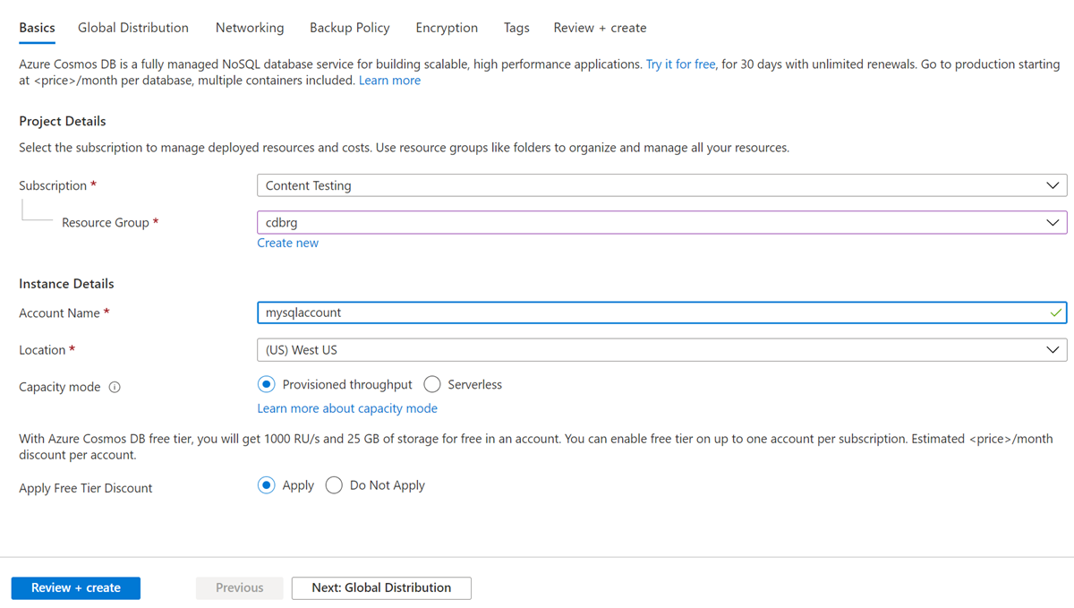 设置 值 说明 订阅 订阅名称 选择要用于此 Azure Cosmos DB 帐户的Azure订阅。 资源组 资源组名称 选择一个资源组,或者选择“新建”,然后输入新资源组的唯一名称。 帐户名 唯一的名称 输入名称以标识 Azure Cosmos DB 帐户。 请使用唯一的名称,因为 documents.azure.cn 会附加到您提供用于创建 URI 的名称中。 名称只能包含小写字母、数字和连字符 (-)。 它必须是 3-44 个字符。 位置 离用户最近的区域 选择用于托管 Azure Cosmos DB 帐户的地理位置。 使用离用户最近的地点,为用户提供最快的数据访问。 容量模式 预配吞吐量或无服务器 选择“预配吞吐量”以在预配吞吐量模式下创建帐户。 选择“无服务器”以在无服务器模式下创建帐户。 应用 Azure Cosmos DB 免费层折扣 “应用”或“不应用” 使用 Azure Cosmos DB 免费层,您可以在一个帐户中免费获取前 1000 RU/秒和 25 GB 的存储。 详细了解 免费套餐。 限制总帐户吞吐量 已选中或未选中 限制可在此帐户上预配的总吞吐量。 此限制可防止与预配吞吐量相关的意外费用。 创建帐户后,可以更新或删除此限制。 每个 Azure 订阅最多只能拥有一个免费层 Azure Cosmos DB 帐户,并且必须在创建帐户时选择加入该免费层。 如果看不到应用免费层折扣的选项,则说明订阅中的其他帐户已经应用了免费层折扣。