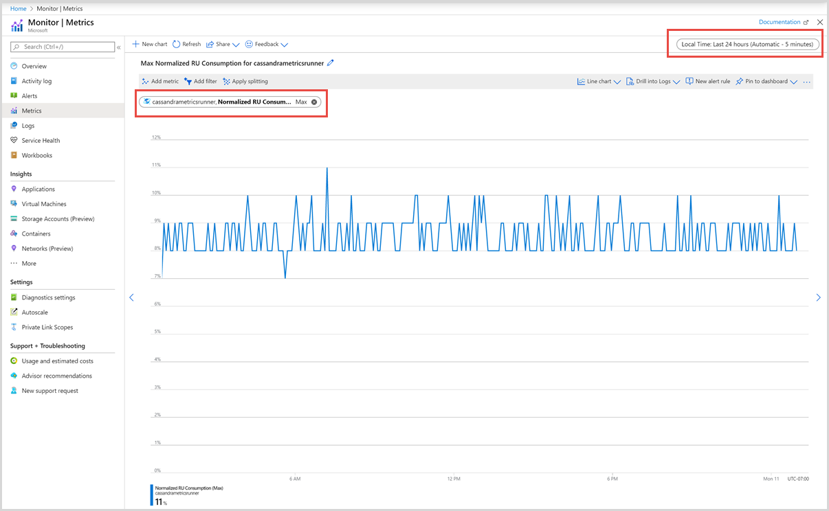 还可以按特定的 CollectionName、DatabaseName、PartitionKeyRangeID 和区域筛选所显示的指标和图表。 若要筛选指标,请选择 “添加筛选器 ”,然后选择所需的属性,例如 CollectionName 和感兴趣的相应值。 然后,图中会显示在所选时间段内针对该容器的“规范化 RU 消耗量”指标。