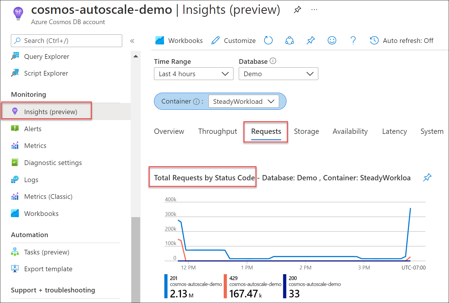 如果你有兴趣查看每秒间隔的请求单位消耗量,以及操作类型,可以使用可选的诊断日志并查询 PartitionKeyRUConsumption 表。 若要大致了解应用程序在 Azure Cosmos DB 资源上执行的作和状态代码,可以使用内置的 Azure Monitor 总请求 数(API for NoSQL)、 Mongo 请求、 Gremlin 请求或 Cassandra 请求 指标。 稍后,可以按 429 状态代码筛选这些请求,并按 作类型拆分这些请求。
