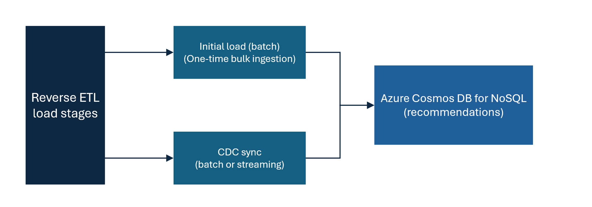 Initial load:初始加载是一次性批处理步骤,用于将所有历史数据从 Delta 表导入到用于 NoSQL 的 Azure Cosmos DB。 它通过确保运营数据存储具有完整的历史数据,为您的反向 ETL 管道奠定基础。 在开始对数据进行增量同步之前,此加载是一个基本步骤。