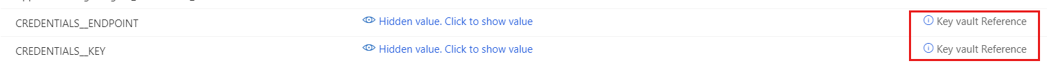 设置 说明 名称 CREDENTIALS__ENDPOINT键 获取在本教程的前面部分你在密钥保管库中创建的 cosmos-endpoint 机密的机密标识符。 按照以下格式输入标识符: @Microsoft.KeyVault(SecretUri=<secret-identifier>)。提示