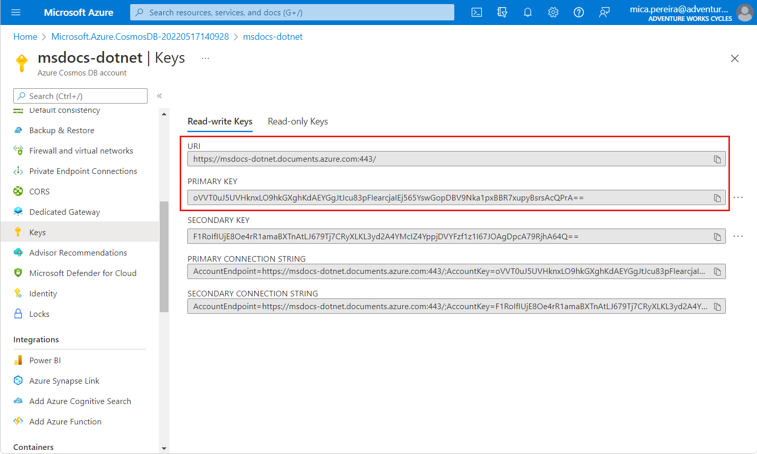 从 Azure Cosmos DB for NoSQL 帐户页中,选择“密钥”导航菜单选项。