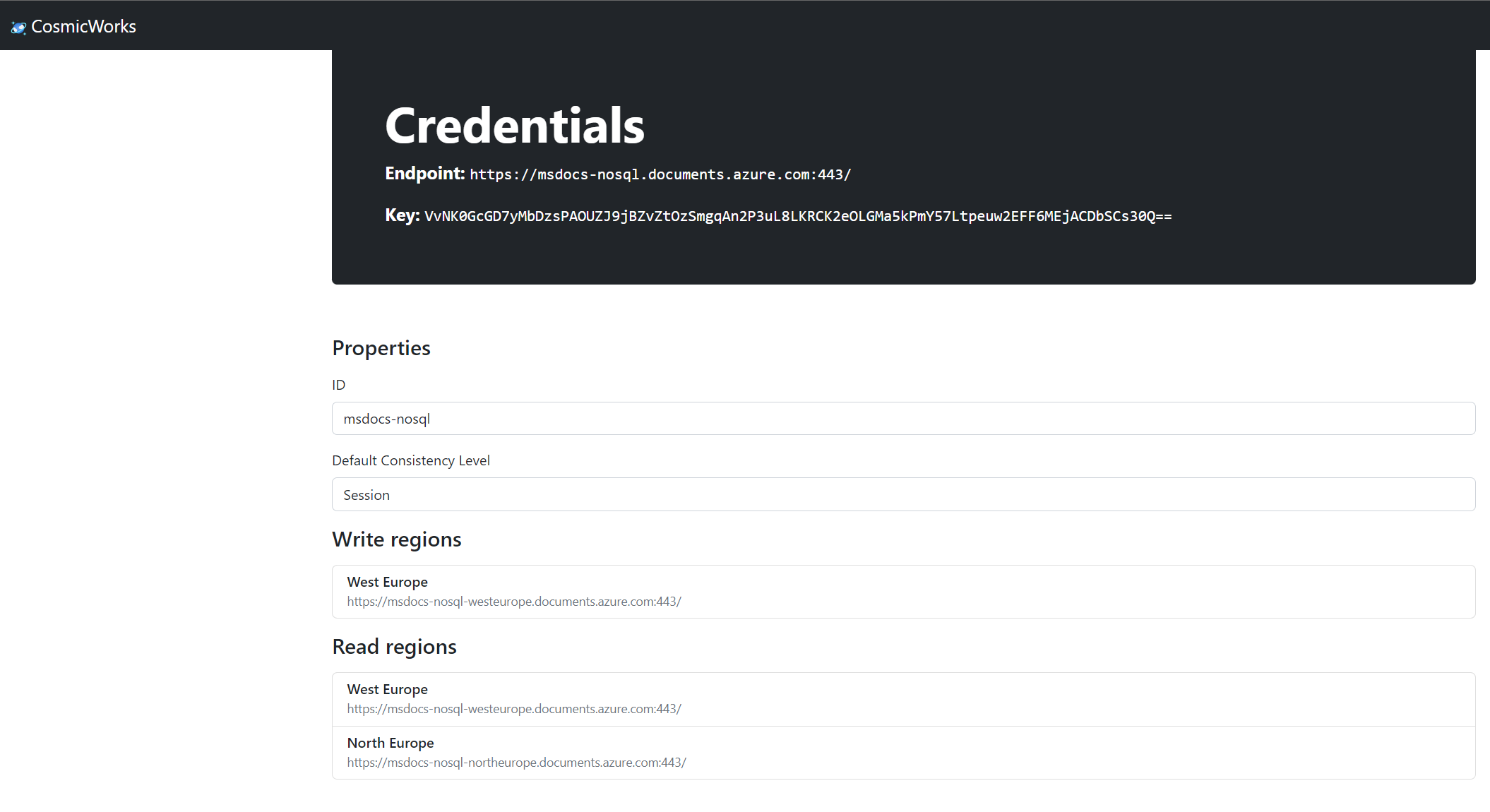 记录“URI”和“主密钥”字段中的值。 稍后你将在本教程中使用这些值。