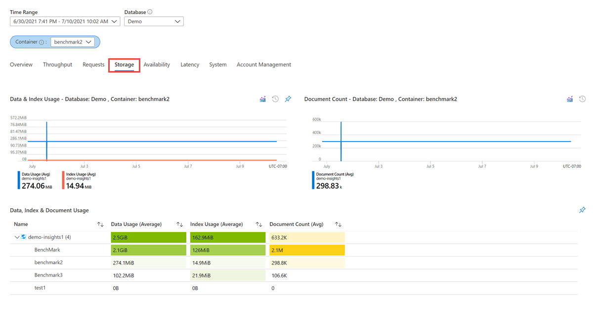 请务必根据数据使用情况、索引使用情况和文档使用情况来确定任何分区容器的storage分布。 可以最大限度地减少索引使用量,最大限度地增加数据使用量并优化查询。 若要获取此数据,请导航到 Insights 窗格,然后打开 Storage 选项卡。