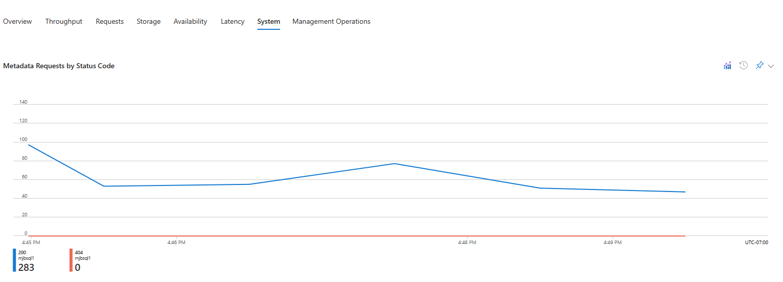 若要开始,请转到 Azure portal 然后导航到 Insights 窗格。 在此窗格中,打开“系统”选项卡。“系统”选项卡显示两个图表。 一个显示帐户的所有元数据请求。 第二个显示存储帐户元数据的帐户 master partition 的元数据请求吞吐量消耗。