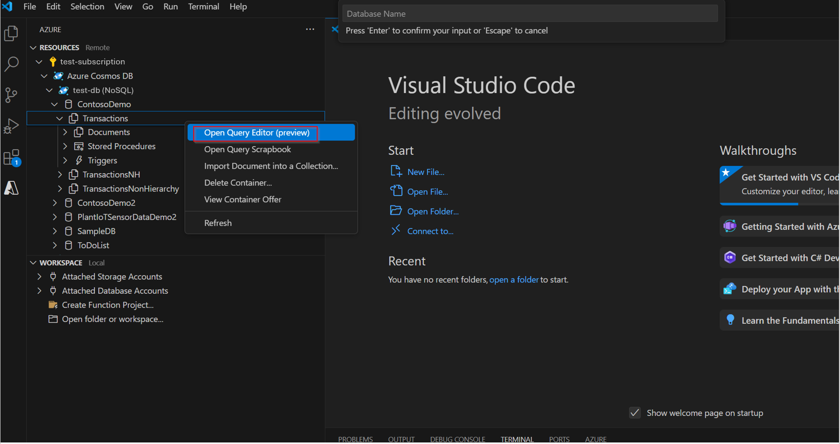 创建和删除数据库/集合:使用资源面板中帐户、数据库或集合上的上下文菜单创建或删除数据库和集合。