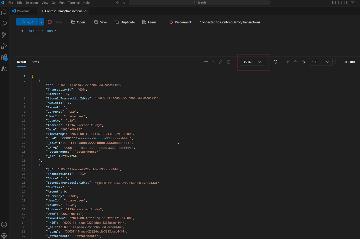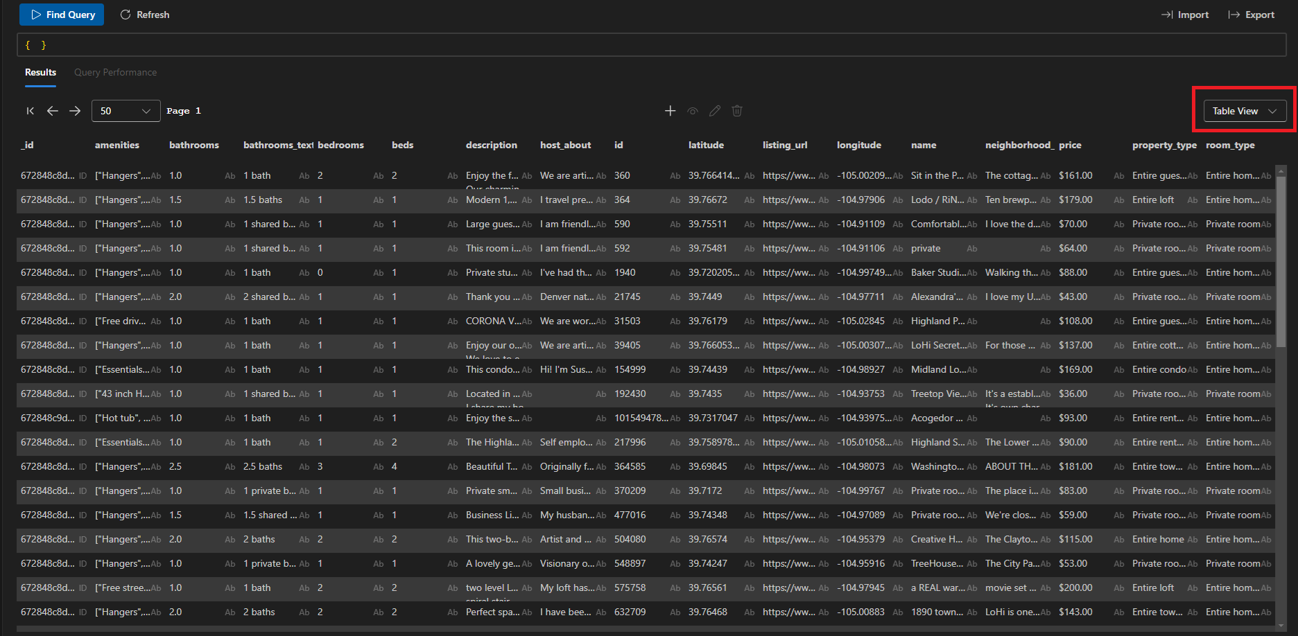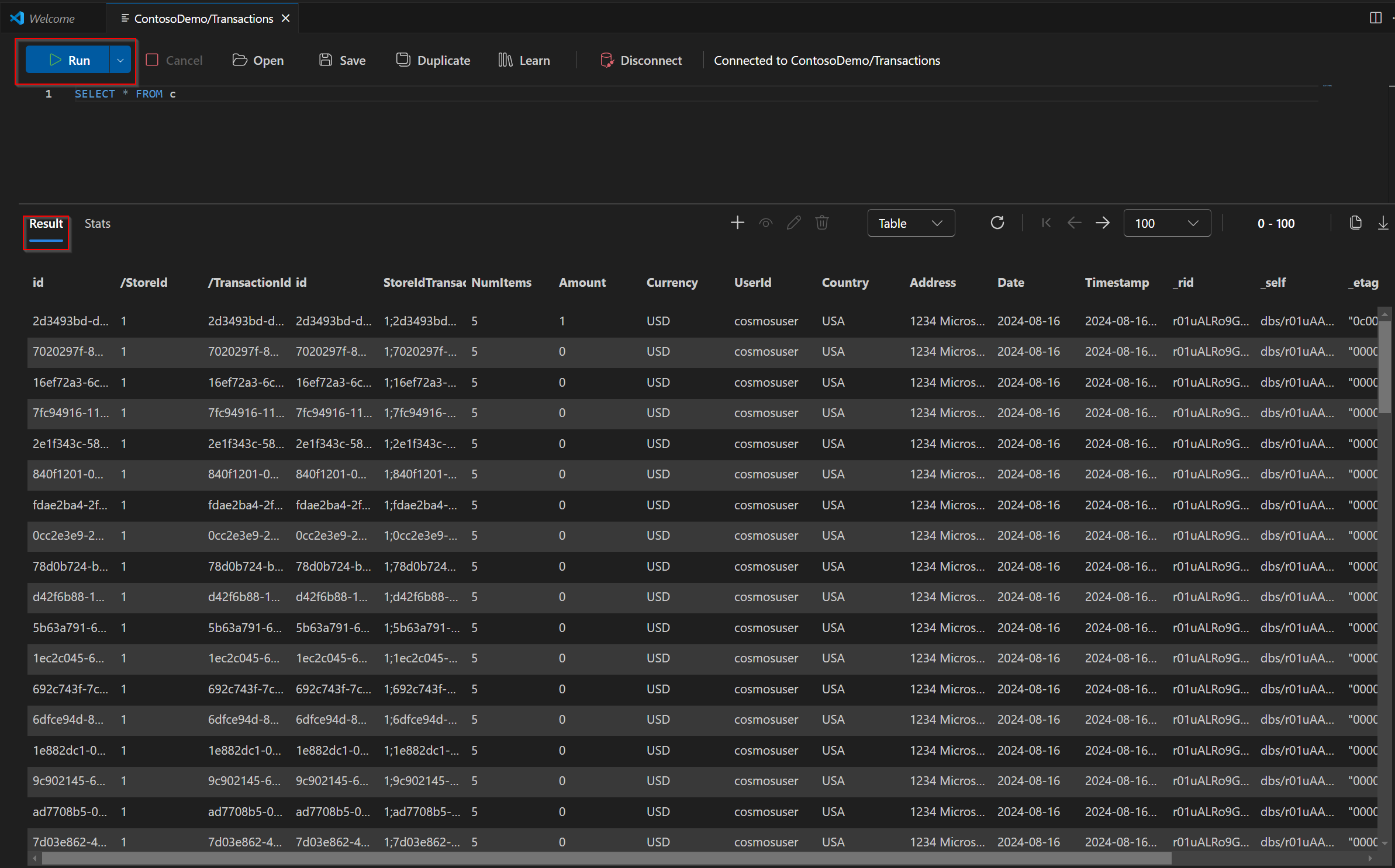 运行查询编辑器中提供的查询,以在表视图中显示数据: