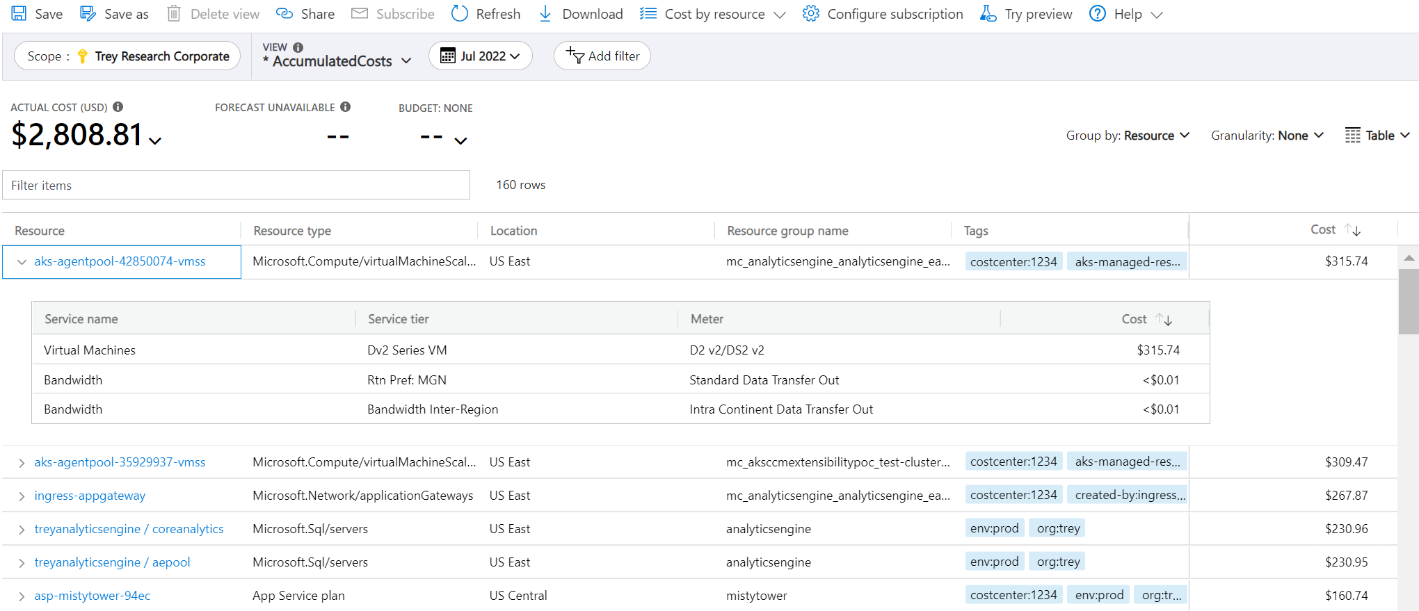 下图显示了资源组名称。 可以按标记分组,以按标记查看总成本;也可以按“资源组名称”分组。