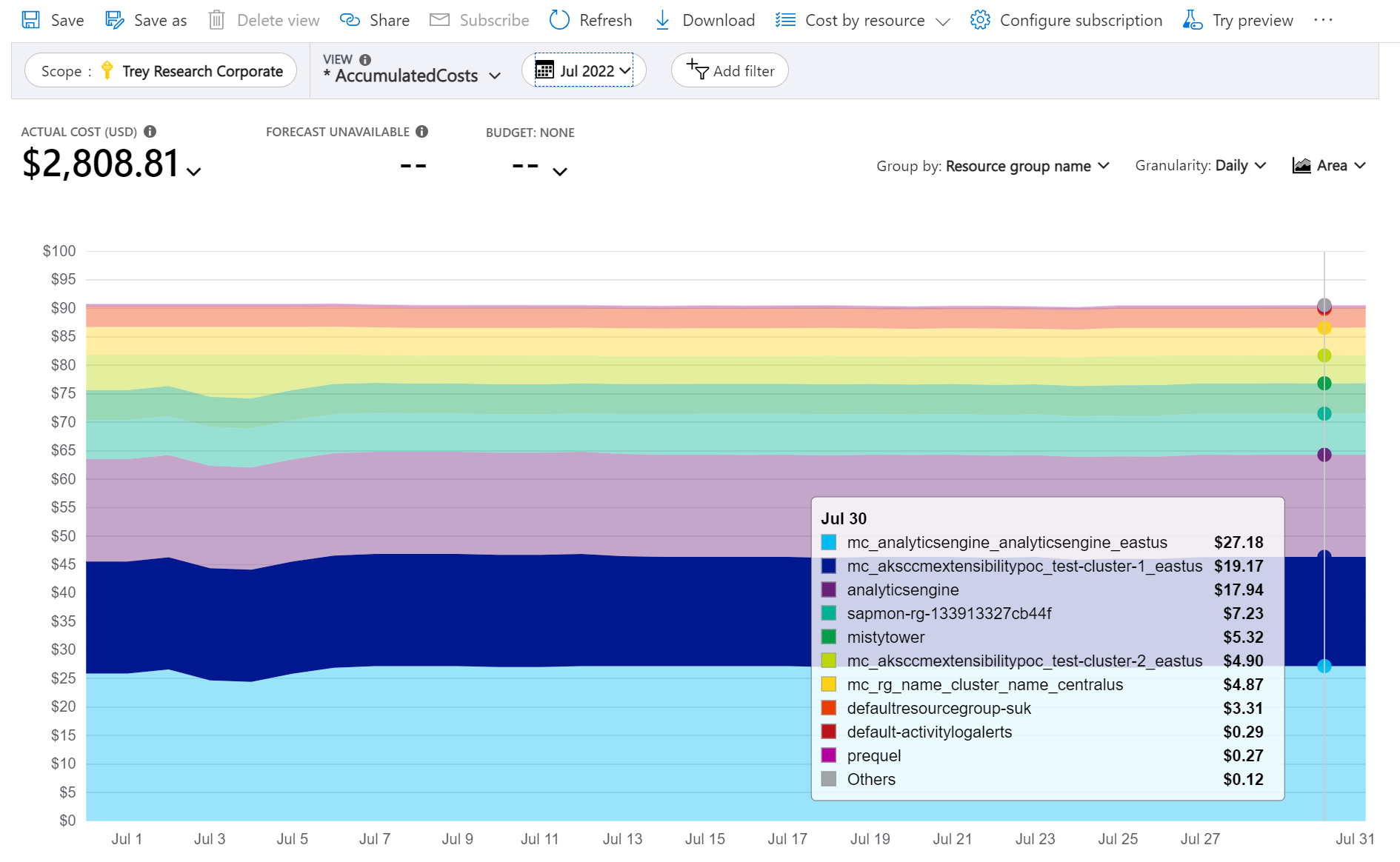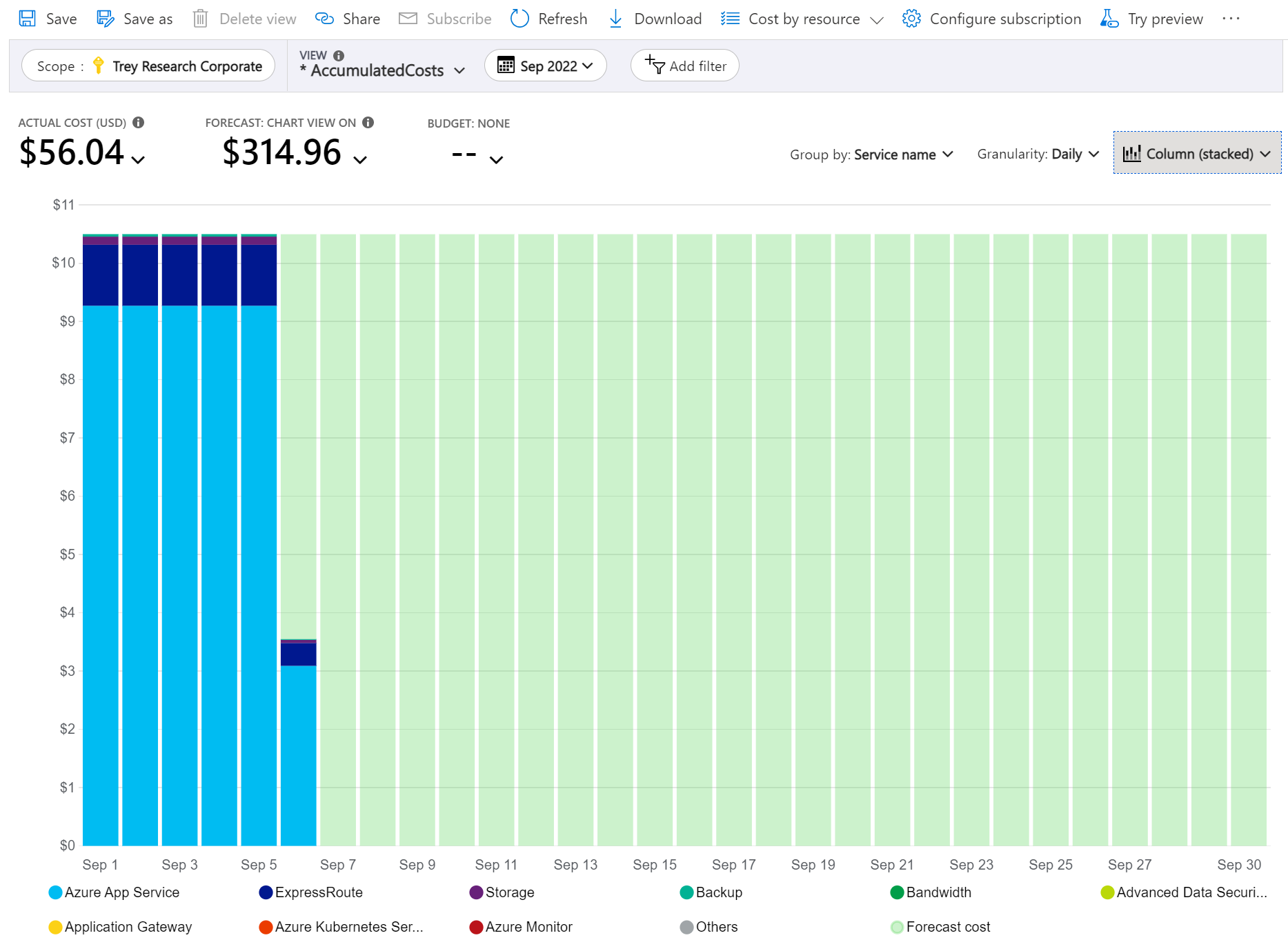 下面是当前月份的 Azure 服务成本视图,按服务名称分组。