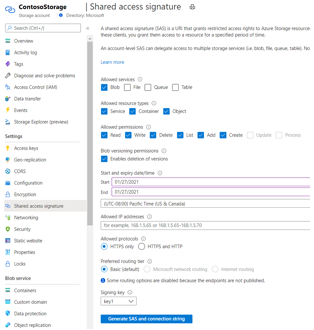 获取存储帐户 SAS 令牌,或使用 Azure 门户创建一个令牌。 若要在 Azure 门户中创建,请使用以下步骤。 若要详细了解 SAS 密钥,请参阅使用共享访问签名 (SAS) 授予有限的数据访问权限。