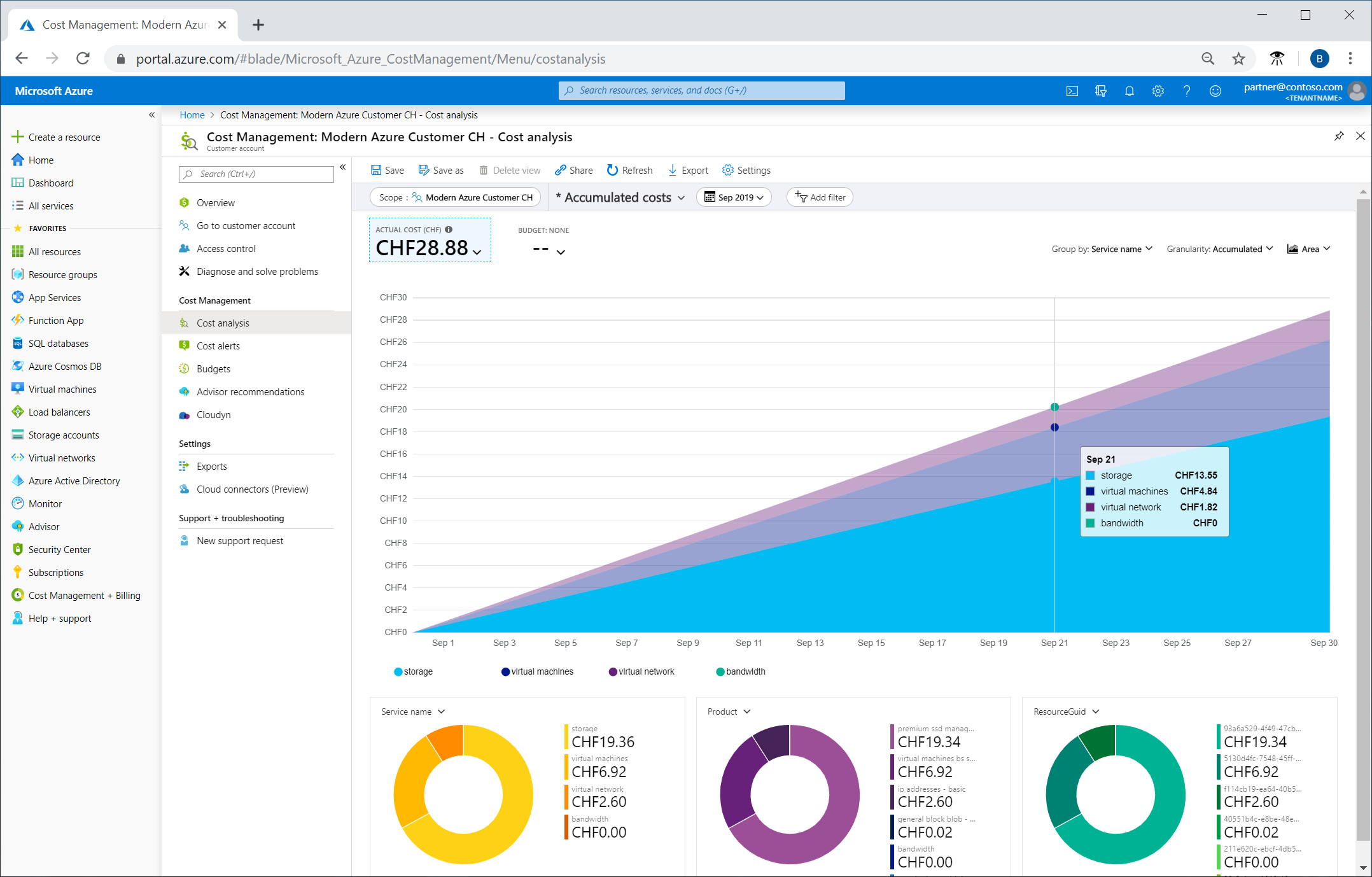 在 Azure 门户中登录到合作伙伴租户,并选择“成本管理 + 计费”。 在“成本管理”下,选择“成本分析”。