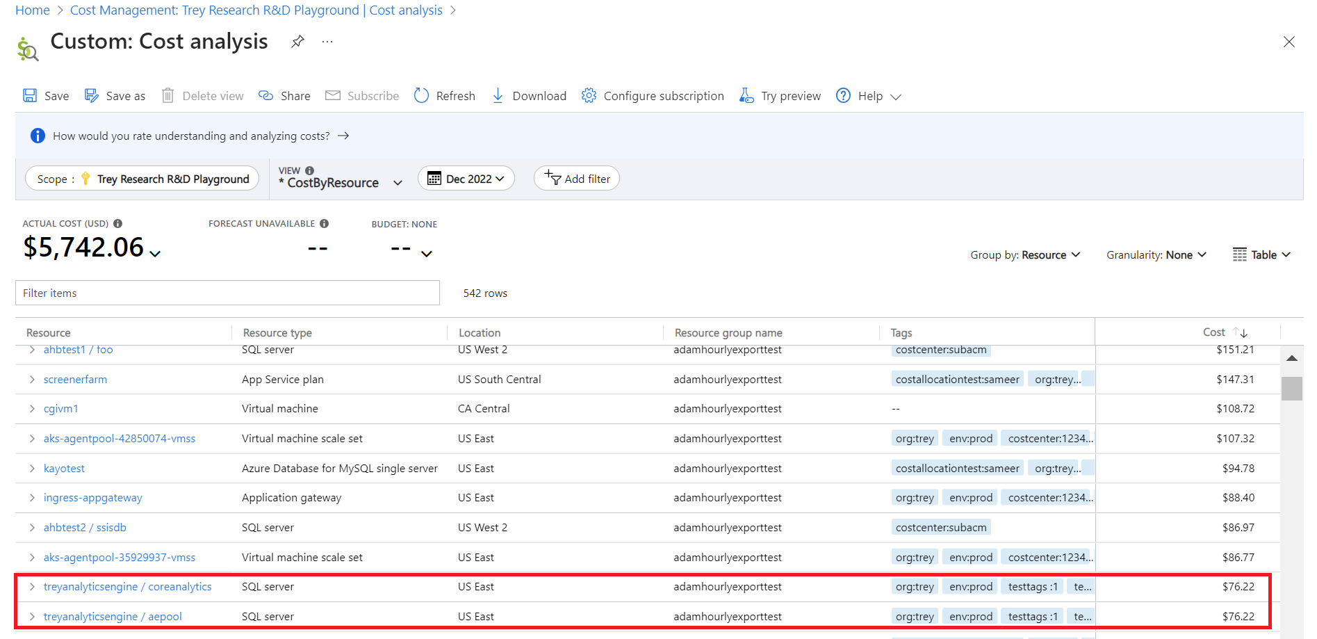 SQL 数据库作为 SQL Server 实例的一部分部署,但使用情况却是在数据库级别进行跟踪。 此外,你可能还会在父级服务器上付费,例如 Microsoft Defender for Cloud。 若要在经典成本分析中获取 SQL 部署的总成本,需要手动汇总服务器和每个数据库的成本。 例如,可以在以下列表中看到 treyanalyticsengine /aepool 弹性池,以及其下的 treyanalyticsengine /coreanalytics 服务器。 但看不到列表中更下方的另一个数据库。 你可以想象,当需要具有许多数据库的大型服务器实例的总成本时,这种情况将是多么令人不安。