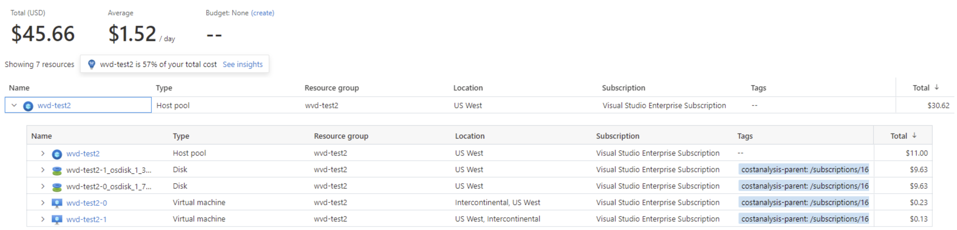 例如,假设为某个 Azure 虚拟桌面主机池配置了两个 VM。 标记 VM 和相应的网络/磁盘资源将它们分组到主机池下,从而可以看到主机池部署中的会话主机 VM 的总成本。 如果你还包含通过主机池提供的任何云解决方案的成本,则此示例结果会更丰富。