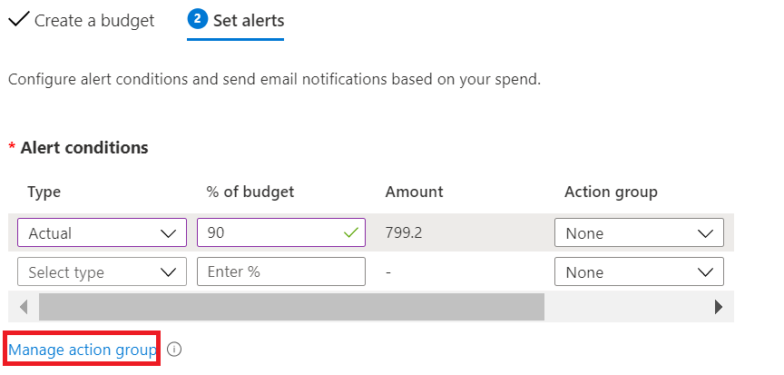 若要创建或更新操作组,请在创建或编辑预算时选择“管理操作组”。