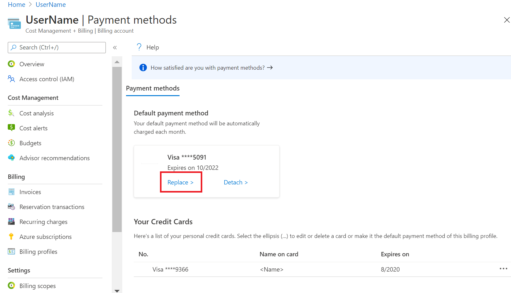 选择“替换”,以更改当前信用卡。