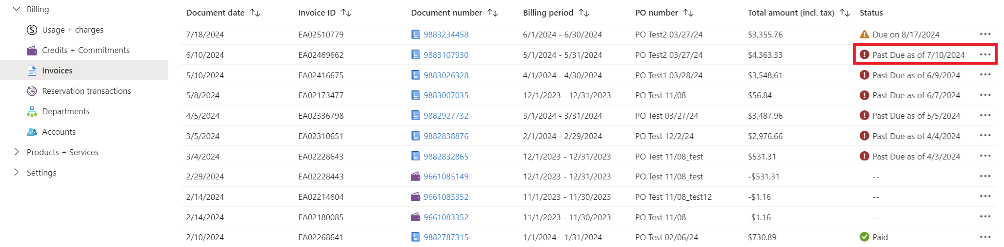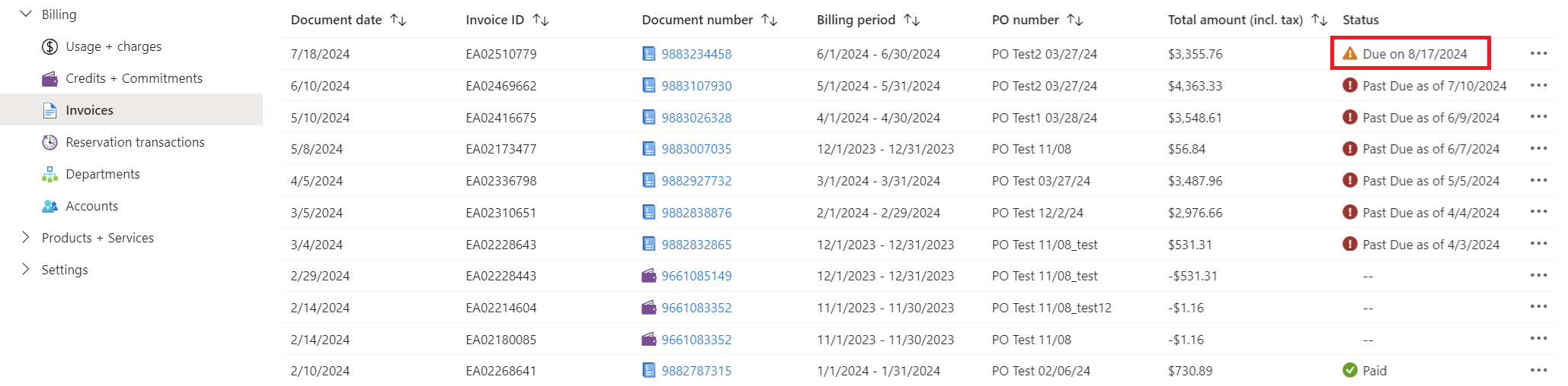 在“发票”窗格中,检查显示状态为“到期日期: 日期”的费用。 这些项目是待处理费用。