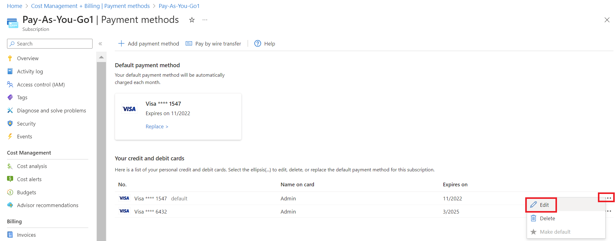 对于要编辑的信用卡,请选择行末尾的省略号 (...)。 然后选择“编辑”。