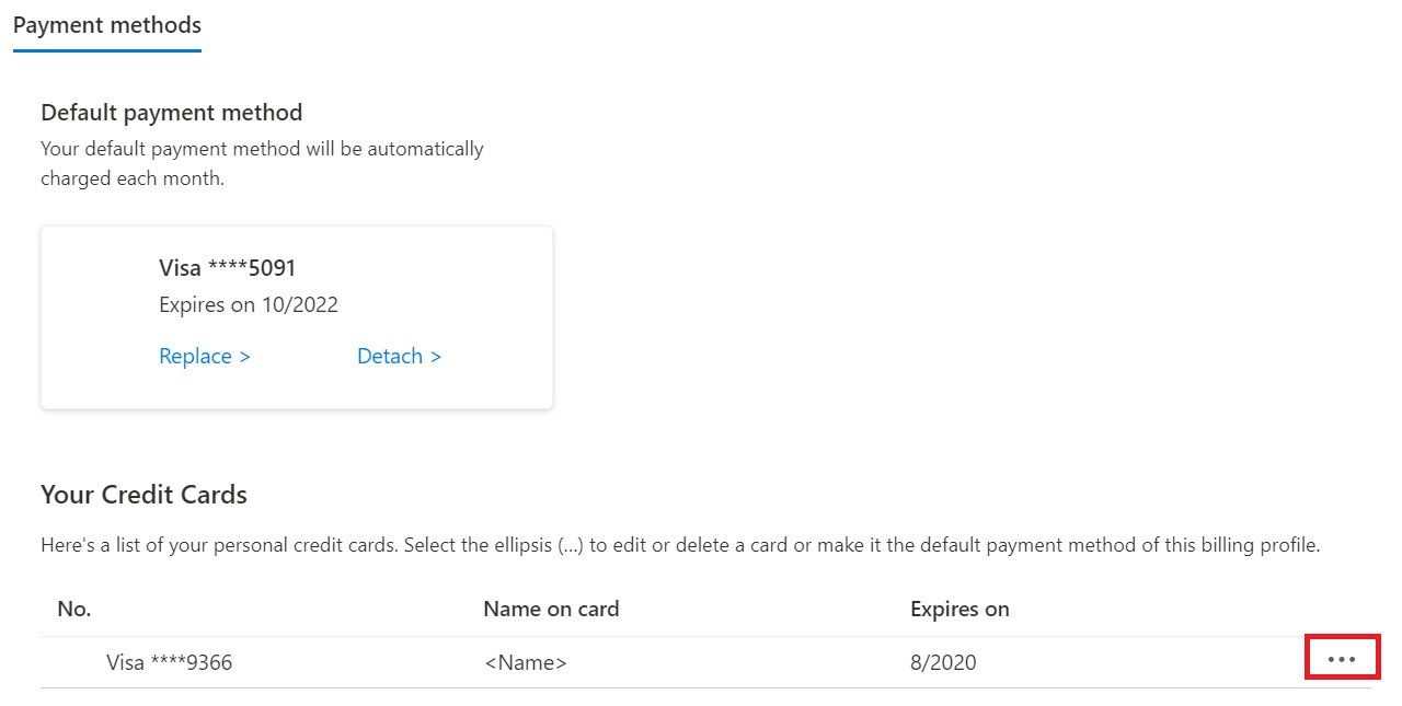 可使用以下步骤,将订阅的默认信用卡替换为已保存到帐户中的信用卡。 此过程会更改所有其他订阅的信用卡。